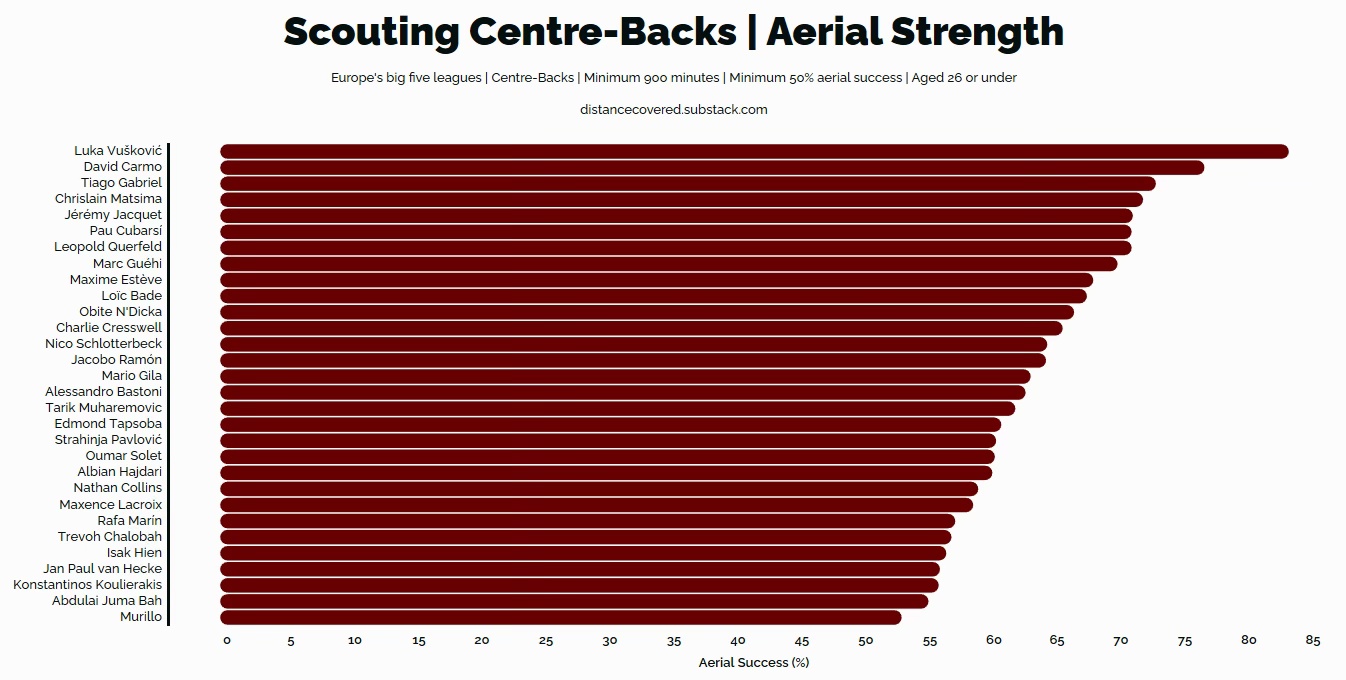 I liked Nico Schlotterbeck and Jan Paul Van Hecke, for example, because it’s much easier to use numbers to assess possession value versus defensive power. Those two are better than Jacquet on the ball, but they’re also five and six years older than him without possessing the same physical ceiling.