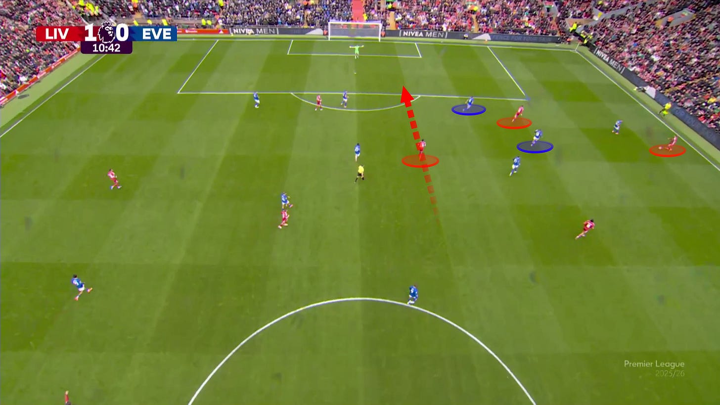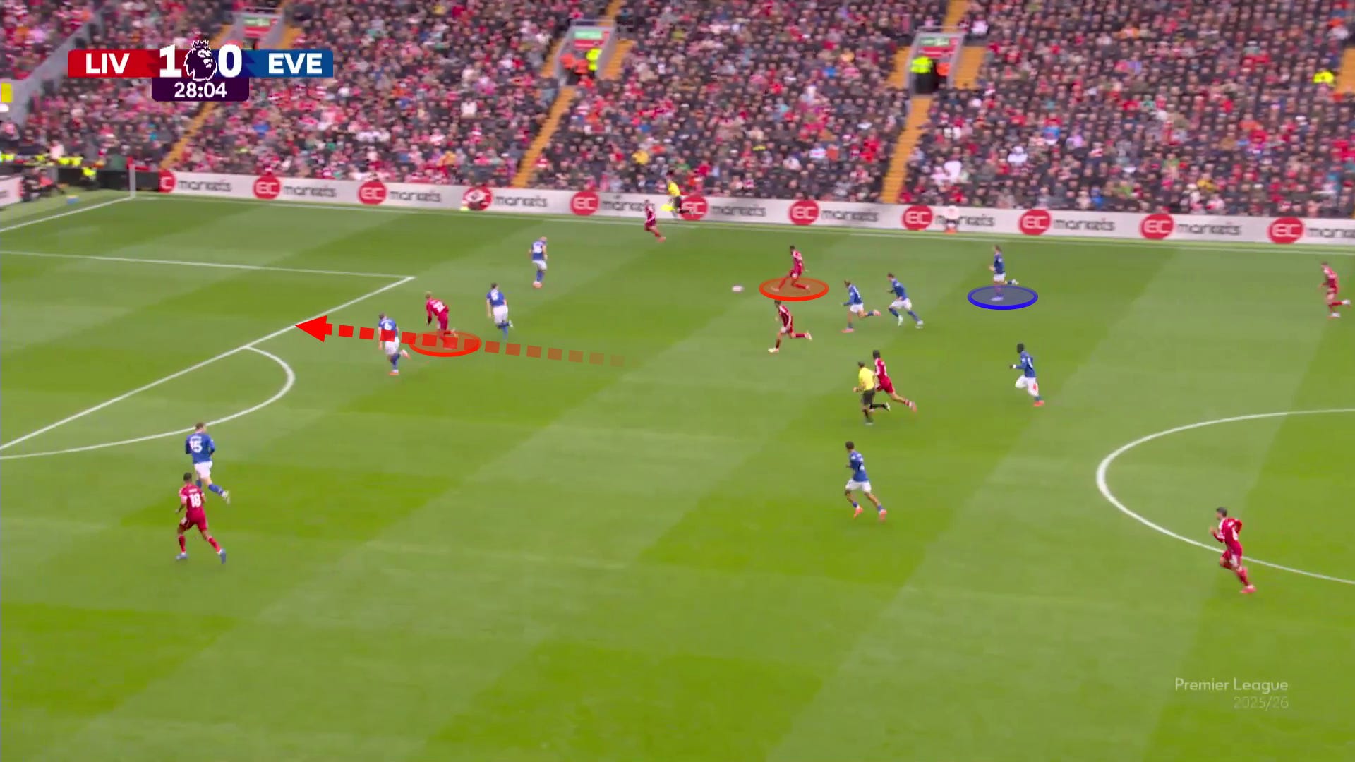 Michael Keane tracked Bradley as instructed, resulting in a gap forming between him and his centre-back partner, James Tarkowski. Salah found that space with a delicate lofted pass, before Ryan Gravenberch found the net with a genius finish. Go back and watch it again.