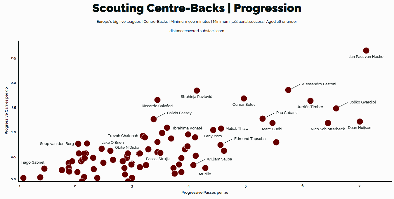 And one final note. Despite scouting for a centre-back, I’m going to lean quite heavily on in-possession metrics here. I know, you want somebody who kicks people. But publicly available data struggles to understand anything beyond what happens when a player has the ball.