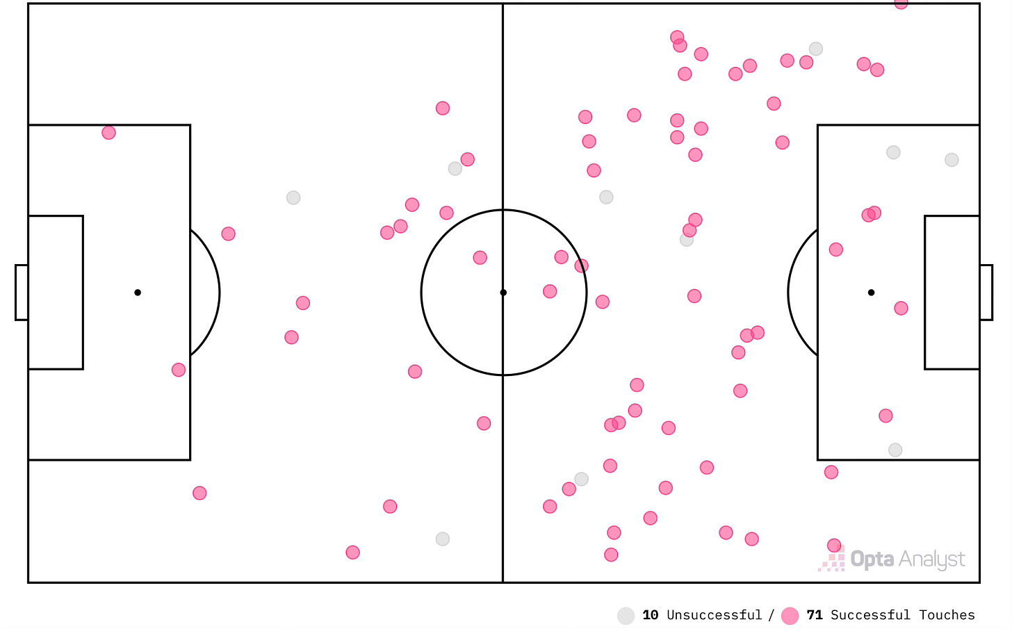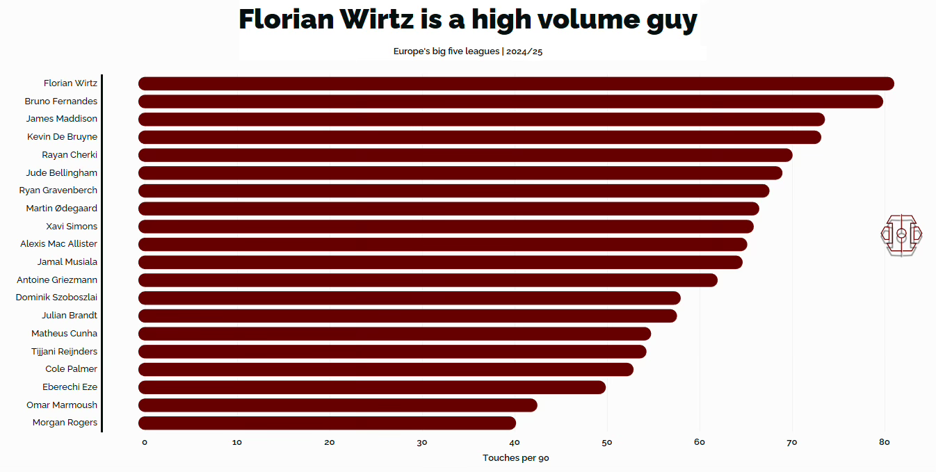 Do you know how crazy it is for a number ten to accumulate more touches than both of his centre-back teammates? Most touches and most shots is an insane combination. Bananas. So uncommon.